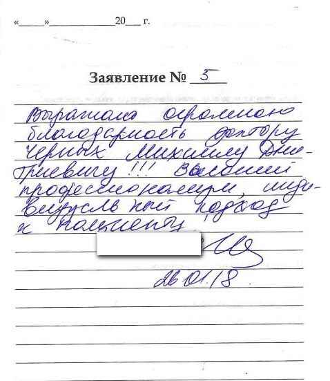 Выражаю огромную благодарность доктору Черных Михаилу Дмитриевичу!!! Высокий профессионализм, индивидуальный подход к пациенту!