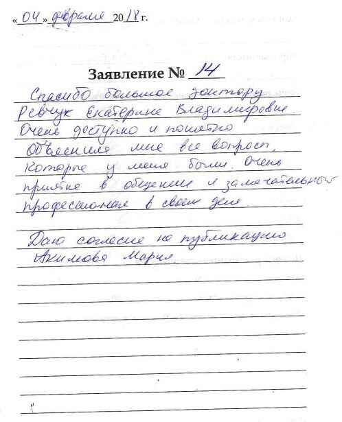 Проходила лечение у Ревчук Екатерины Владимировны. Замечательный доктор! Внимательно выслушала о проблеме и подобрала эффективное лечение. Большое спасибо!